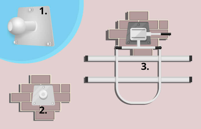 Eine schlaue Methode zum platzsparenden Verstauen ist die Wandhalterung. Diese besteht aus der Kugel einer Anhängerkupplung (1.), die auf einer Stahlplatte montiert ist. Eine solche Wandhalterung erwerben Kunden im Einzelhandel. Diese Stahlplatte befestigen Nutzer in gewünschter Höhe an einer Wand (2.), beispielsweise in der Garage. Wird der Fahrradträger nicht benötigt, montieren Nutzer ihn hier schnell (3.), sicher und ohne Verschwendung von Stauraum. Sollen auch die Räder platzsparend aufbewahrt werden, bringt der Nutzer entsprechend der Anzahl der Drahtesel Fahrrad-Wandhalterungen an.
