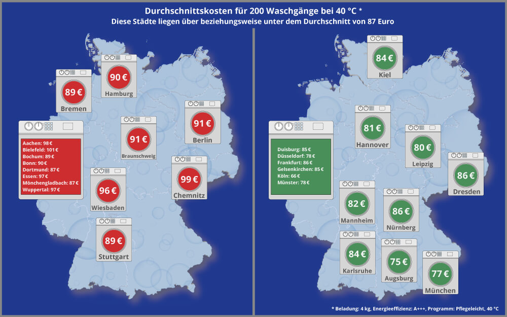 Die Redaktion von Netzvergleich hat die Kosten für das Waschen von Wäsche in den 30 größten Städten Deutschlands analysiert. Die Kosten setzen sich aus den Strompreisen sowie den Gebühren für Trink- und Abwasser der städtischen Grundversorger zusammen. Anhand des Verbrauchs einer modernen und effizienten Waschmaschine (A+++) wurden sowohl die durchschnittlichen Kosten für einen einzelnen Waschgang als auch für 200 Waschgänge errechnet. Als Rechnungsgrundlage dienten außerdem verschiedene Waschprogramme zwischen 20 und 90 Grad Celsius. Das gesamte Ranking sowie Details zu den Kosten diverser Waschprogramme gibt es hier.